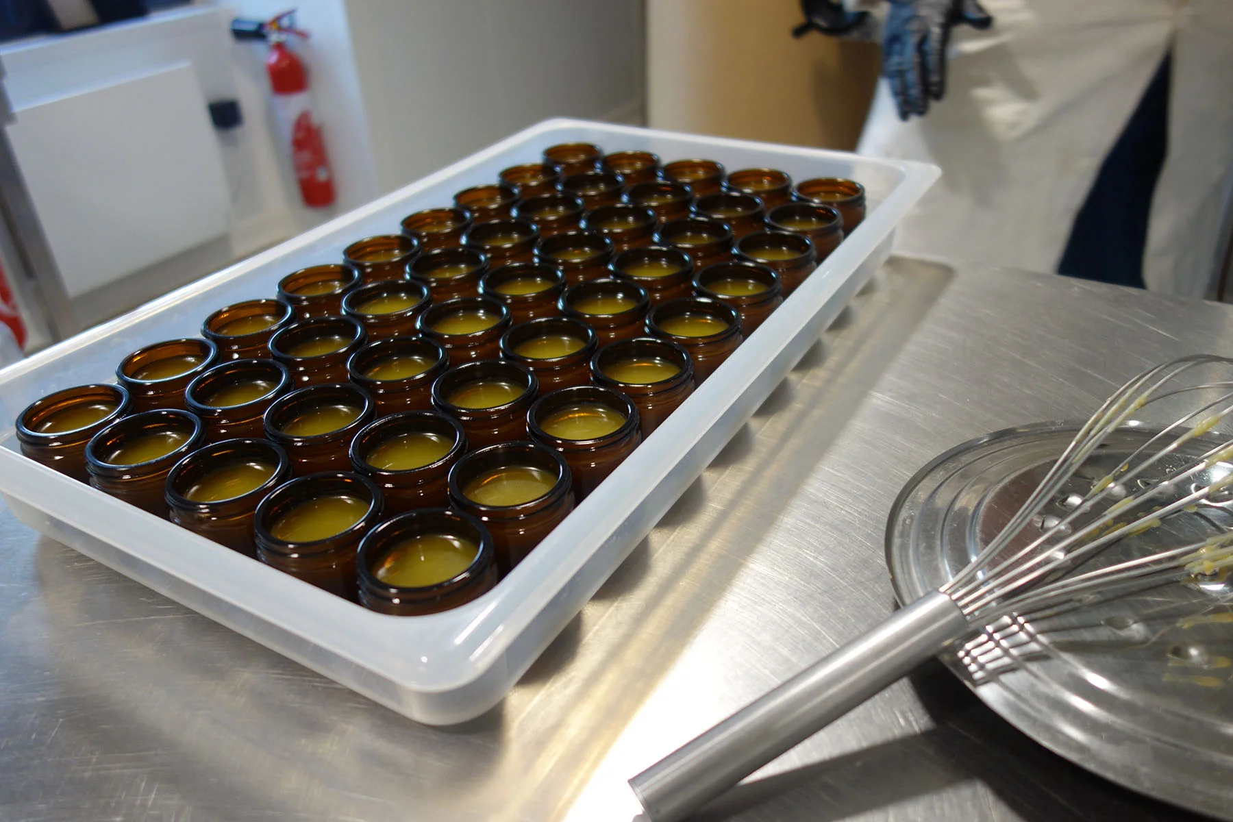 Au bout d’un petit quart d’heure, une fois que tous les ingrédients ont été bien mélangés et que la composition est homogène, nous récoltons dans des pichets en inox le précieux liquide qu’il ne reste plus qu’à conditionner. Production du jour : cent petits pots de cinquante grammes, remplis avec soin, doseuse à piston et surtout balance de précision, car ici, c’est au gramme près !