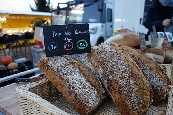 Mais l’accès à du bon pain, c’est aussi une question de moyens. Même si chez Phylia on n’a pas des prix exorbitants, malgré tout, sur le portefeuille des personnes cela a un impact. Nous avons choisi d’appliquer une tarification solidaire. Tous nos produits ont trois prix et ce sont les clients qui choisissent en fonction de leurs moyens. Le prix orange c’est le prix juste, le prix bleu, c’est le tarif solidaire avec +10 % et le prix vert, le prix mini avec -20 %. Et chacun choisit librement le tarif qu’il souhaite, sans se justifier.