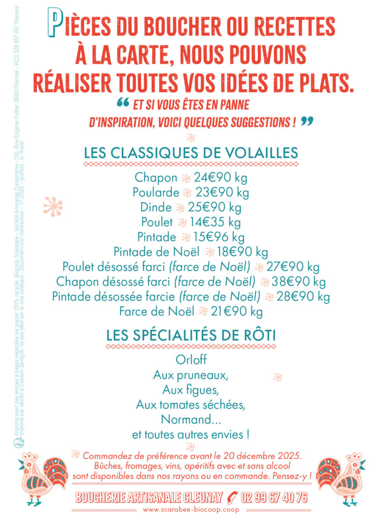 Les fêtes de fin d’année sont toujours une bonne raison de se faire plaisir. Cela tombe bien, les bouchers de Scarabée sont ravis de vous faire découvrir quelques spécialités de volailles et rôtis. Avec des plateaux de fromage pour conclure en beauté, les repas de fêtes, ça devrait être plus souvent !Les fêtes de fin d’année sont toujours une bonne raison de se faire plaisir. Cela tombe bien, les bouchers de Scarabée sont ravis de vous faire découvrir quelques spécialités de volailles et rôtis. Avec des plateaux de fromage pour conclure en beauté, les repas de fêtes, ça devrait être plus souvent !