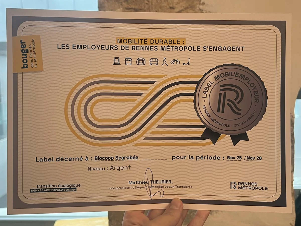Scarabée a été récompensée par Rennes Métropole pour son soutien aux mobilités durables. Le label Mobil’employeur n’est pas juste une récompense mais un dispositif complet qui encourage notre coopérative à poursuivre son action pour favoriser les déplacements écoresponsables de ses salarié·es.