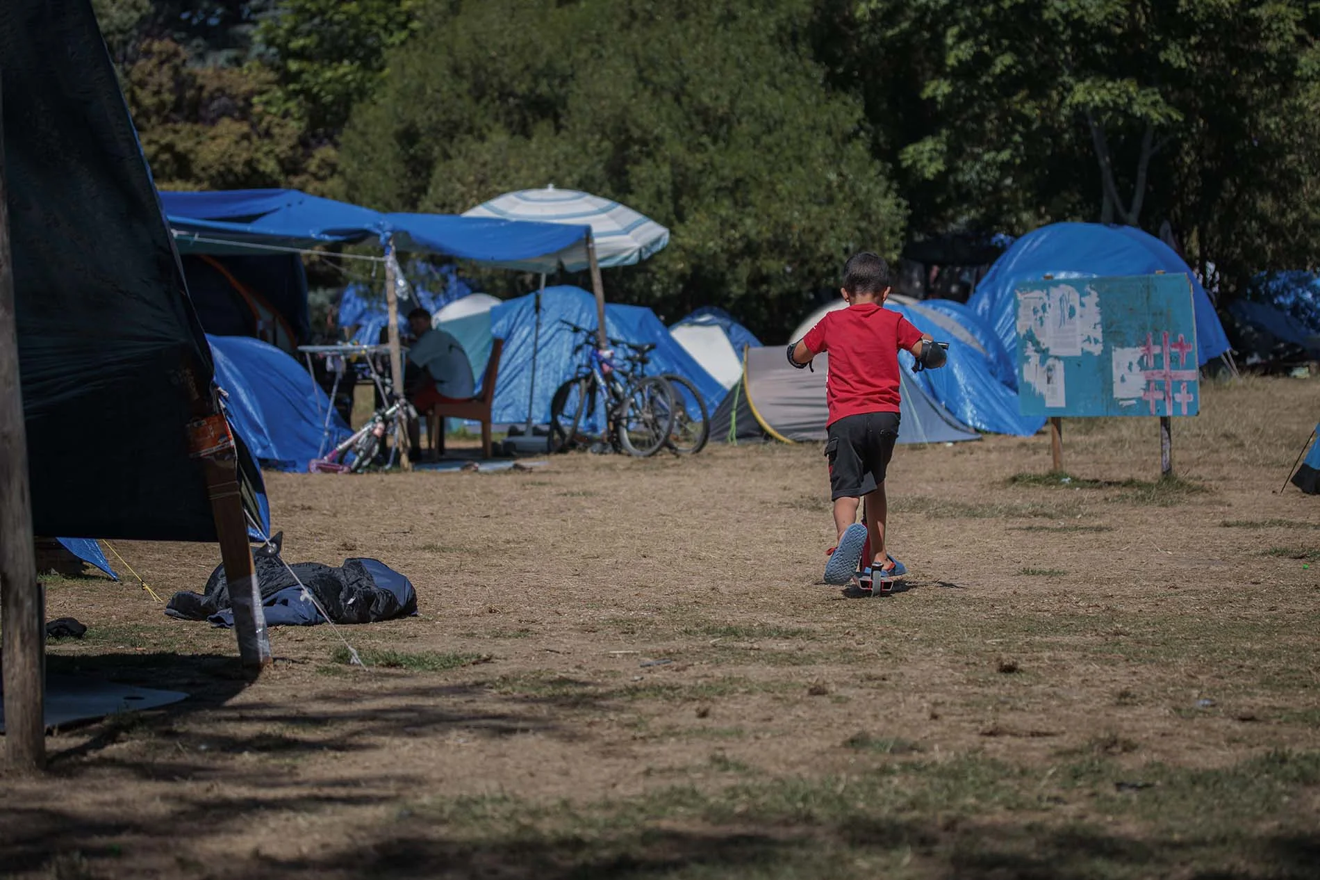 Mais la réalité, c’est que l’hébergement d’urgence est totalement saturé. La réalité, c’est un campement dans le parc de Maurepas qui accueille deux cent trente personnes. Deux cent trente personnes parmi lesquelles soixante-dix sont mineures, deux cent trente personnes dont la moitié sont des femmes ou des filles. Fabien déplore cette situation : « les personnes vivent en toile de tente dans des conditions très rudes, avec un accès à l’eau limité et seulement deux toilettes à proximité. »